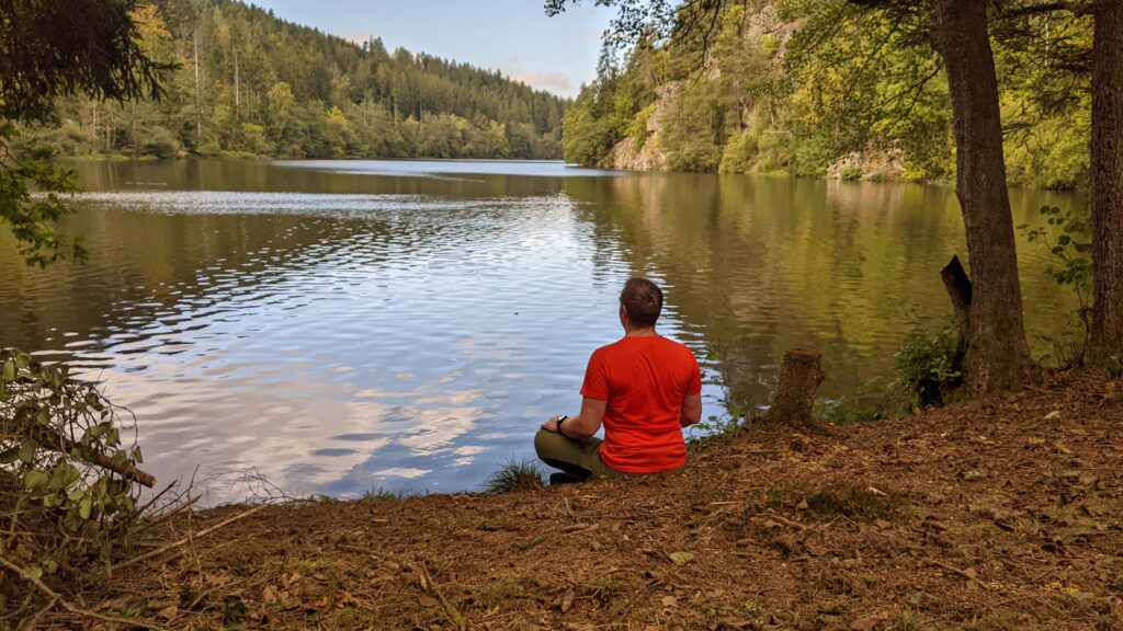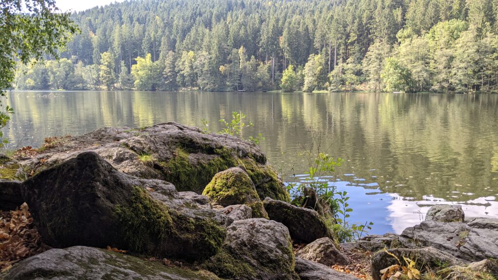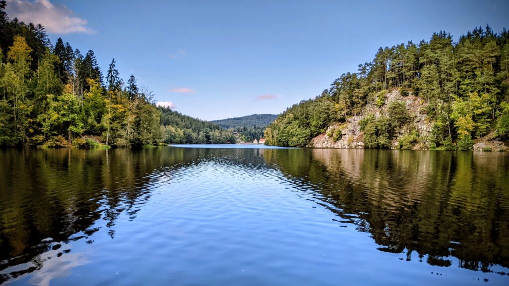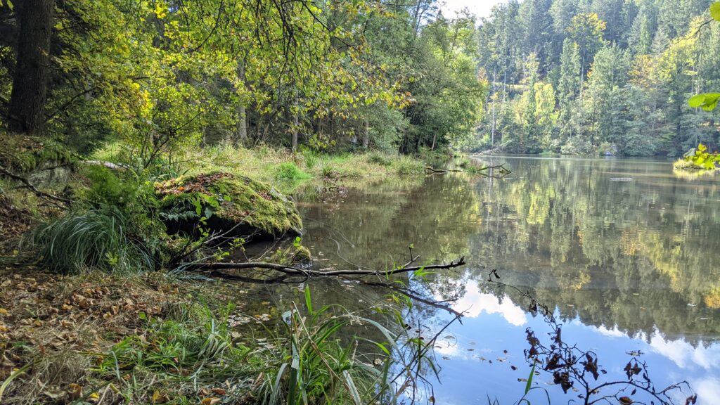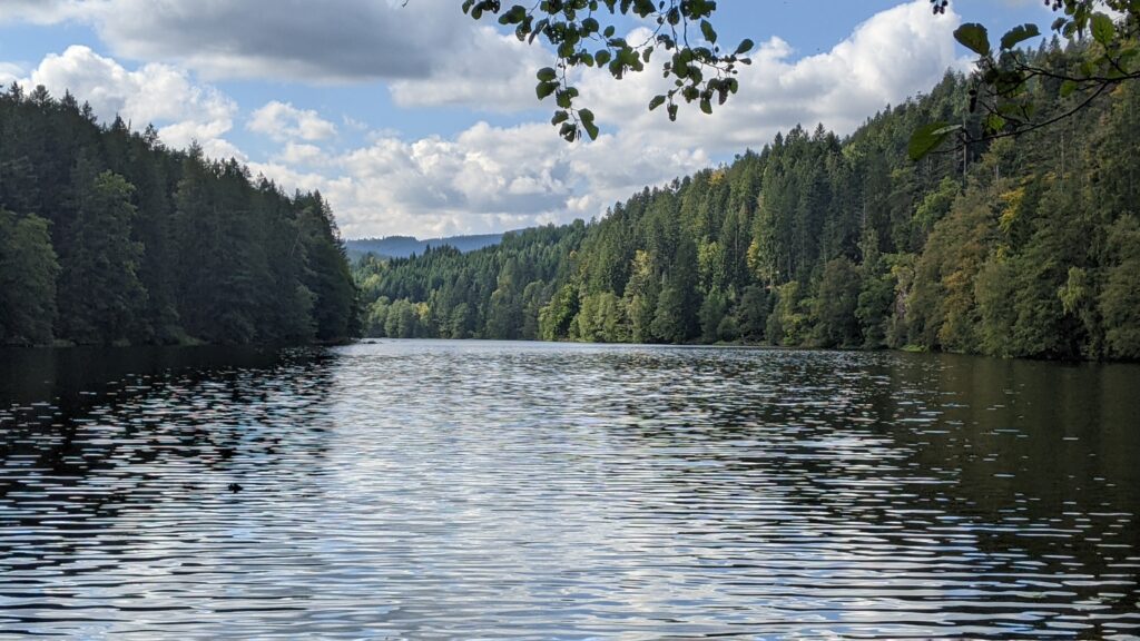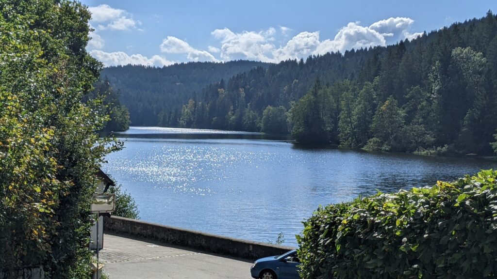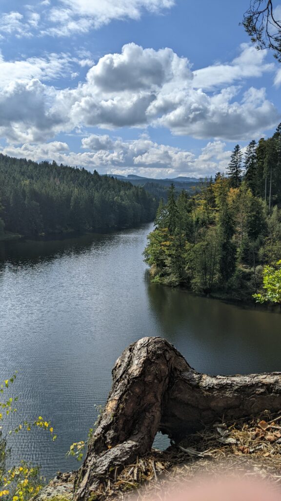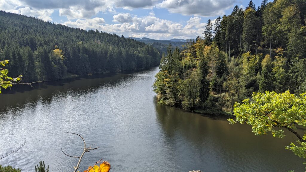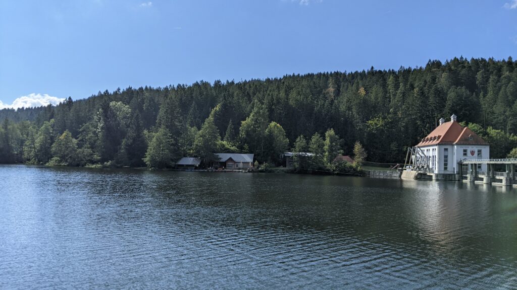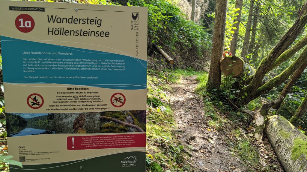 Unsere Tour beginnt am Parkplatz Höllensteinsee in der Nähe von Viechtach. Von dort aus führt uns der Weg zunächst ein paar Höhenmeter hinunter zum gewaltigen Staudamm des Höllensteinsees. Der Stausee selbst, entstanden in den 1920er Jahren für das Höllenstein-Kraftwerk, staut den Schwarzen Regen auf über 5,6 Kilometer Länge auf und sorgt für eine beeindruckende Kulisse aus dunklem Wasser und bewaldeten Hängen.