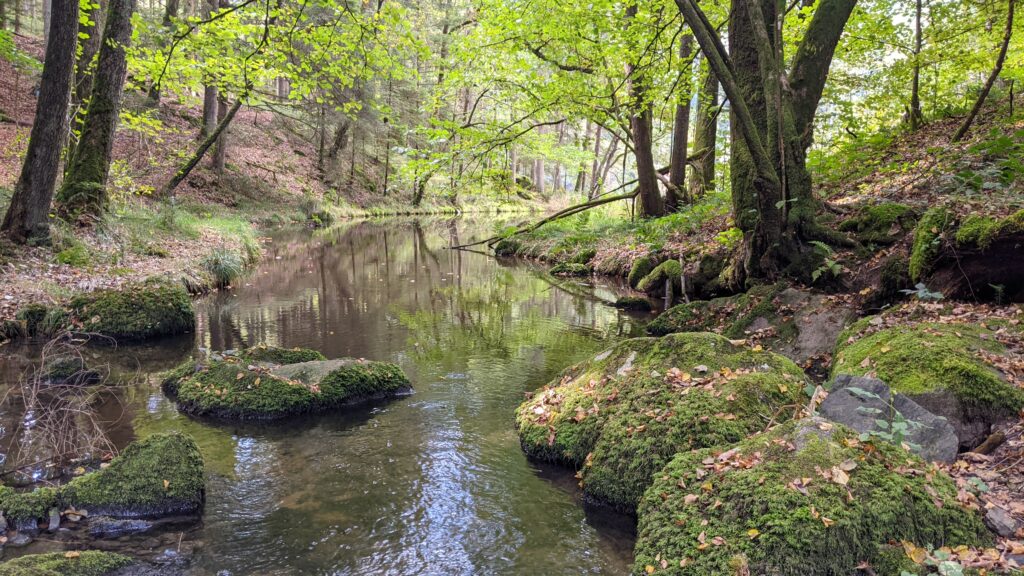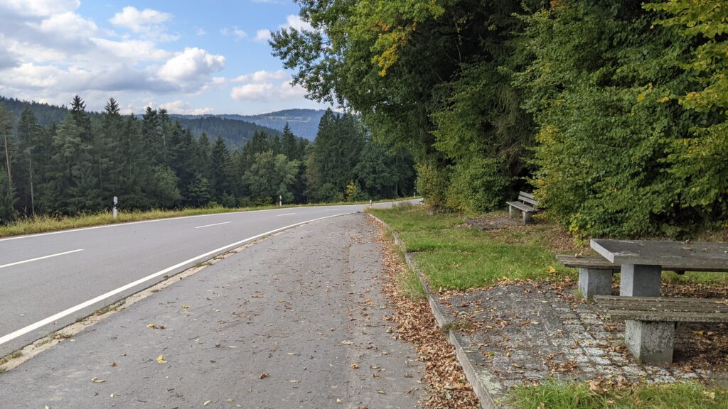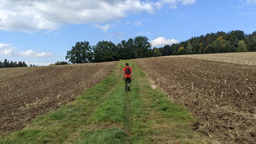 Nach etwa 3,5 Kilometern verlässt der eigentliche Steig das Seeufer und taucht in den dichteren Wald ein. Nach dem wilden Uferpfad geht es nun auf Forst- und breiteren Wanderwegen weiter, die uns wieder zurück Richtung Staudamm führen. Diese Abschnitte sind entspannter und geben den Blick frei für die beeindruckende Stille des Bayerischen Waldes. Ein kurzes Stückchen mussten wir leider direkt auf der wenig befahrenen Straße gehen – hier ist erhöhte Vorsicht geboten, auch wenn es sich nur um einen kurzen Abschnitt handelt.